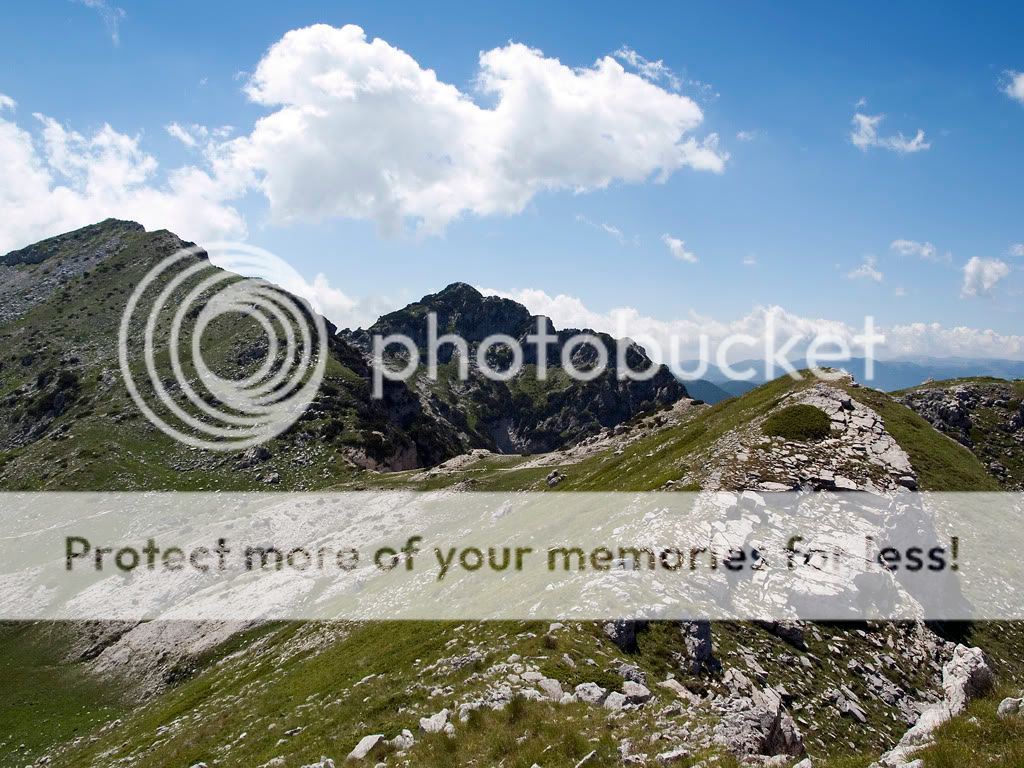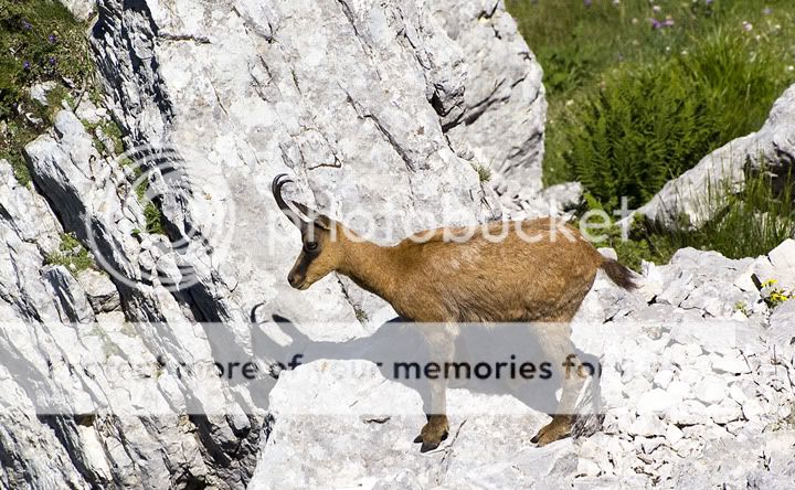 Anche se vorrei continuare mi fermo. Ci sono i camosci. Prima mi riposo 10 minuti, un panino, un succo, un pò d'acqua. Poi tiro fuori la macchina fotografica. Il solito cafoncello italiota mezz'ora prima aveva fatto scappare tutte le bestiole. Cosi facendo un pò di roccia mi apposto su un cucuzzolo ed attendo.. E dopo 20 minuti eccoli che tornano.